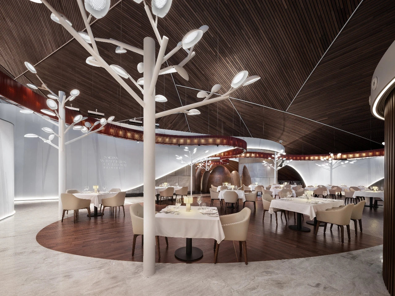 ? ? ? ?作為中國最高藝術殿堂的國家大劇院,上演著大大小小不同類別的演出,來自舞蹈藝術提煉而成的”飄帶”作為給予空間新的視覺元素。就像是一縷絲帶,讓它以自然的型態(tài)飄落在空間當中,曲線的飄帶更像是個裝置藝術品,不僅和建筑曲面拱頂形成呼應,也和建筑原有的龍燈融為一體,既能起到空間分隔功能的作用,又能豐富室內空間的層次。