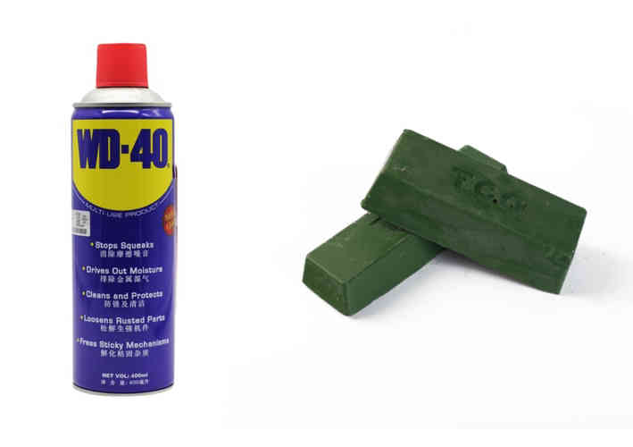 海綿吸水后,將銹跡擦拭干凈,在海綿上倒99蠟,再反復擦拭,最后用棉布擦拭干凈。